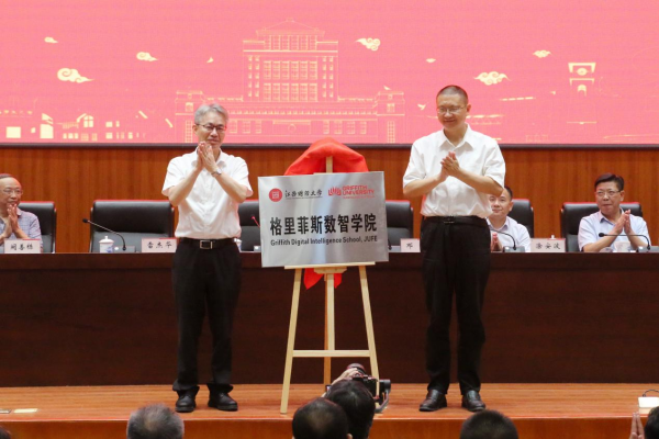 Subsequently, witnessed by all attendees, Lei Jiehua and Liu Yaobin unveiled the plaque for the Griffith Digital Intelligence School, JUFE. Tu Anbo and Yuan Honglin unveiled the plaque for the Economic Foreign Affairs Research Center.